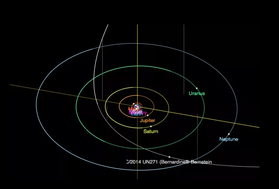 Этот инопланетный объект был просто обозначен как комета в среду (23 июня), всего через неделю после того, как астрономы впервые заметили его в виде крошечной движущейся точки на архивных снимках с камеры Темной энергии в Межамериканской обсерватории Серро Тололо в Чили. Комета теперь известна как комета C/2014 UN271, или Бернардинелли-Бернштейн, в честь ее первооткрывателей, аспиранта Пенсильванского университета Педро Бернардинелли и астронома Гэри Бернштейна.