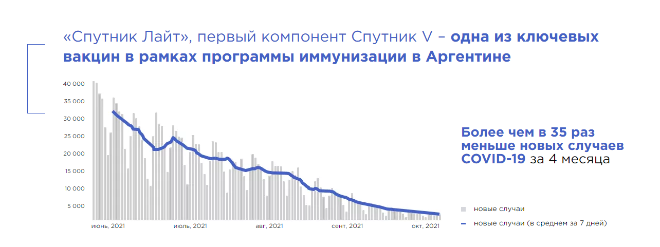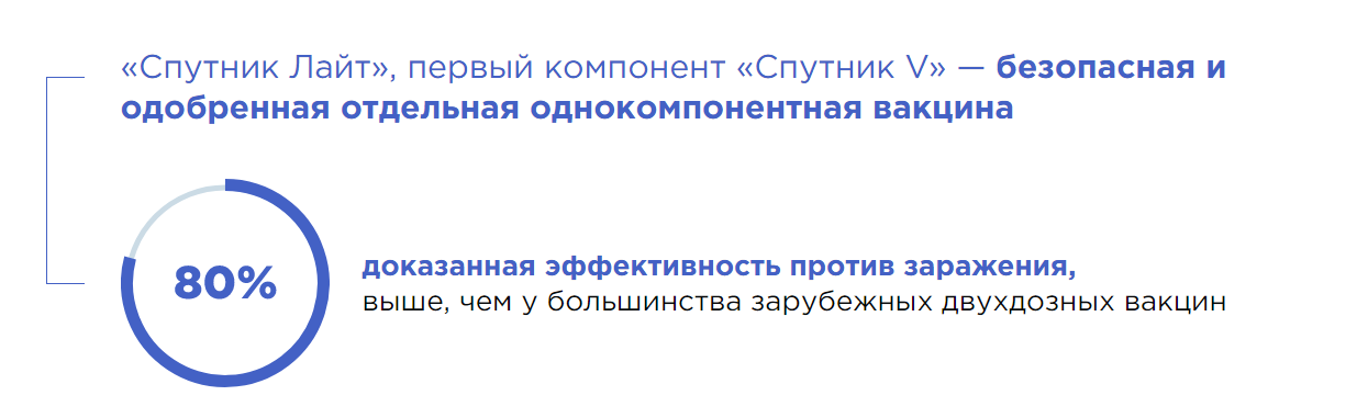 • «Спутник Лайт» показал свою безопасность и высокую эффективность в комбинации с вакцинами AstraZeneca, Sinopharm и Moderna в совместных клинических международных исследованиях.