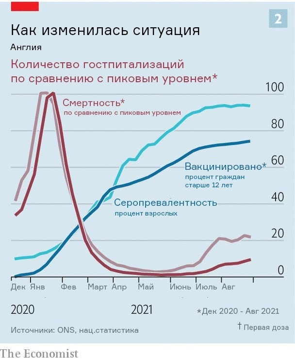 В сентябре 25–35% коек в британских отделениях интенсивной терапии было занято ковидными пациентами, которые, как правило, остаются в больнице на две-три недели, не оставляя места для пациентов, перенесших операцию, которым койка нужна всего на пару дней. Примерно четыре из десяти британцев, госпитализированных с диагнозом COVID-19, не вакцинированы.