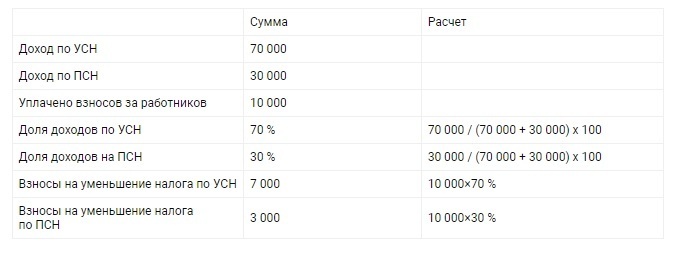 ИП на УСН ПСН распределяет расходы пропорционально долям доходов. По этому же принципу надо делить и взносы, чтобы уменьшить на них налог по ПСН или УСН.
