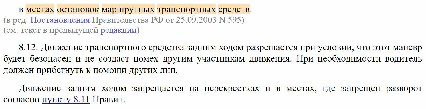 Кто-то сейчас скажет: 15 метров. Напоминаю: 15 метров - это расстояние, на котором запрещена остановка и стоянка (и перед знаком на таком же расстоянии). Про расстояние, на котором от места остановки маршрутных транспортных средств запрещены разворот, движение задним ходом, ничего не сказано.
