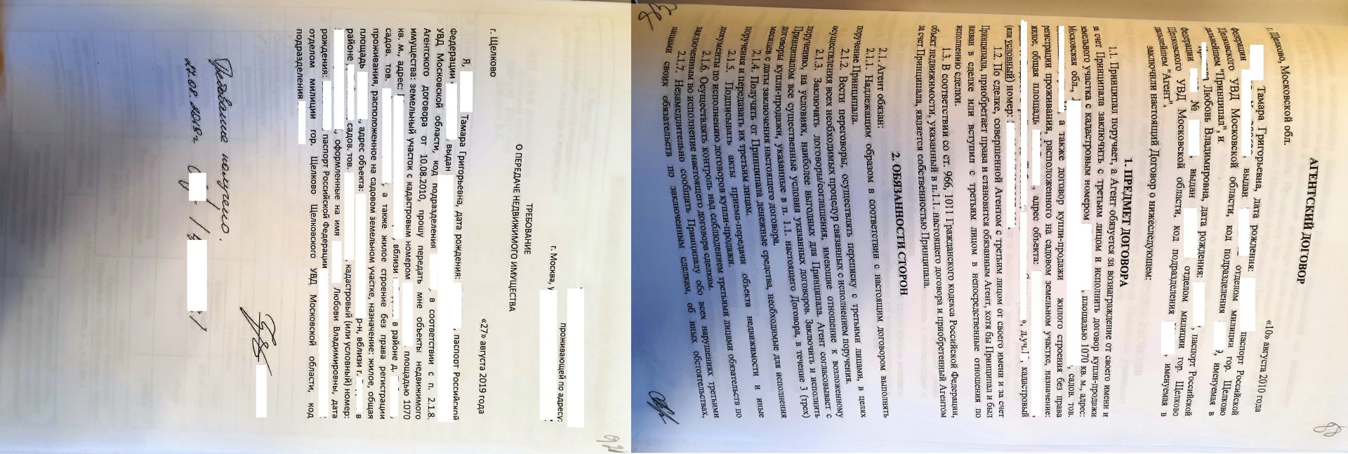 В процессе были предъявлены документы 3-й стороной (матерью жены), что оказывается в 2010 году мама заключает агентский договор со своей дочерью т.е. с ответчиком, на приобретение данного участка с домом, и якобы «дает» ей сумму в пределах 30 000 000 рублей на покупку в пользу принципала по агентскому договору.