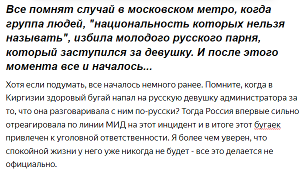 Но у меня также есть предположение для чего власть начала поддерживать русских людей - дело в рейтингах. Россию может разрушить не проплаченные митинги внесистемников, а именно русский бунт. Когда русские люди годами не чувствовали себя под защитой перед диаспорами, а статья 282 УК РФ применялась в подавляющем случае к русским, то рано или поздно это бы привело к хаосу.