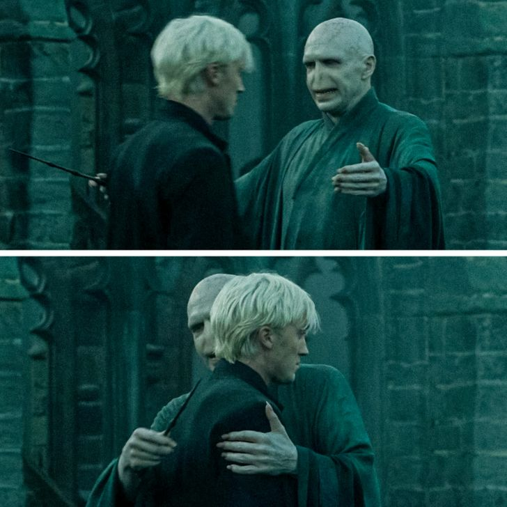 3. Объятие, которым Волан-де-Морт одарил Драко в "Гарри Поттере и дарах смерти" Часть 2", было полностью импровизированным. Отсюда и неловкость обоих актеров.