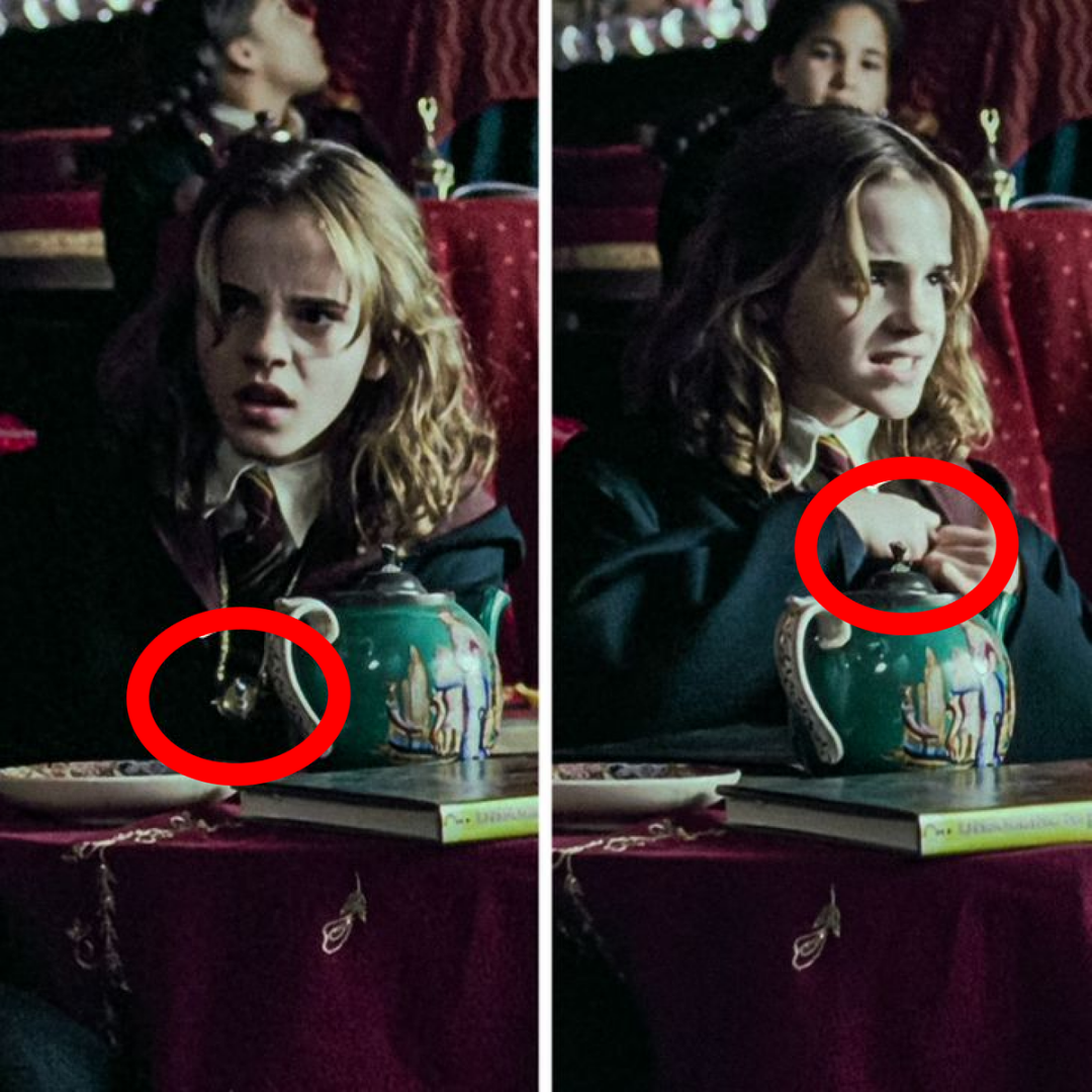 2. В третьей части, когда Гермиона появилась в классе из ниоткуда, мы действительно видим у нее на шее "Маховик времени", который она прячет в следующем кадре.