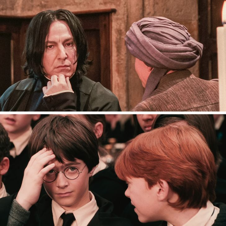 10. В "Гарри Поттере и Философском камне" шрам Гарри горит, когда Снегг смотрит на него, однако на самом деле это из-за Волан-де-Морта, потому что Квиррелл повернул голову.