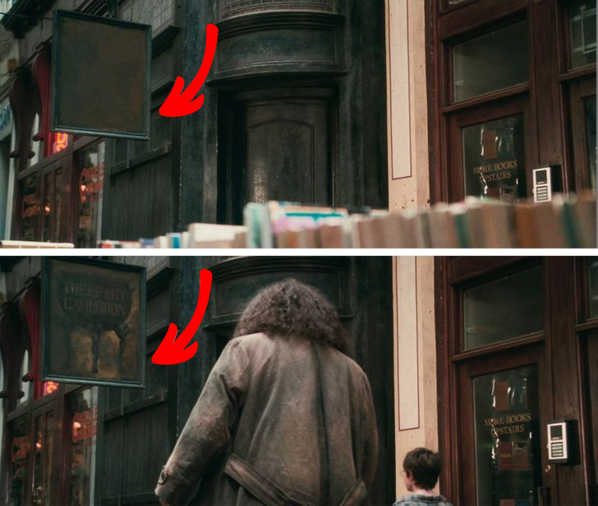 20. Надписи на вывеске Дырявого Котла полностью скрыты, но они проявляются, при приближении волшебников. Скорее всего это делается для того, чтобы держать заведение в секрете от магглов. Когда Гарри и Хагрид проходят мимо, надпись на вывеске проступает.