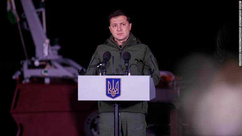 Президент Украины Владимир Зеленский выступает с речью во время визита на передовую в Донбассе 14 октября 2021 года.