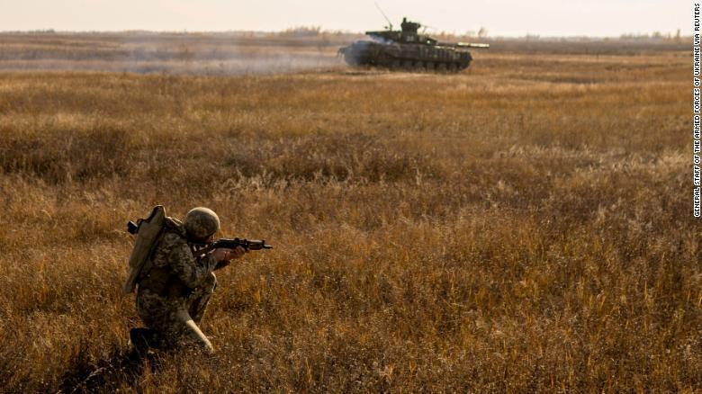 Военнослужащий Вооруженных сил Украины принимает участие в учениях на полигоне у границы с аннексированным Россией Крымом в Херсонской области, Украина, 17 ноября 2021 года.