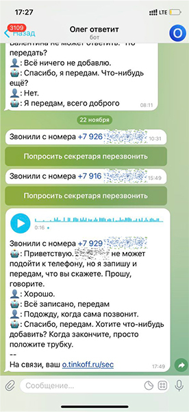 Другая дополнительная фича — кнопка «Попросить секретаря перезвонить», при нажатии на которую Олег звонит по номеру, с которого был звонок, и в случае, если человек возьмет трубку, начинает разговор словами «Здравствуйте. *имя* не отвечает. На связи Олег, что передать». Далее весь разговор также приходит вам в Telegram-чат. В случае с реальными контактами это удобная фишка. Так, например, благодаря секретарю мне пришло сообщение от коллеги, с которой мы договорились пообедать вместе. Но, попав в первый раз на секретаря, оставлять сообщение она не стала. То есть такой дозвон секретаря стал своеобразным триггером, который позволил разговорить человека, не привыкшего общаться с автоответчиками.