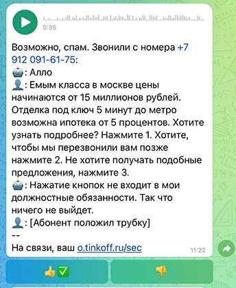 Второй момент, который нужно дорабатывать — встроенный определитель номера. Он действительно работает, правда, есть одно но. Категория входящего вызова высвечивается при расшифровке, но не во время звонка. Для тех, кому непринципиально отправлять все звонки с незнакомых номеров на Олега, этот момент не имеет значения. Для тех, кто, как и автор, боится отдать секретарю не тот звонок, лучше установить любой определитель номера, чтобы видеть информацию о звонившем именно во время звонка, а не кусать локти после. Бесплатный определитель номера есть и у Тинькофф, но он пока доступен только для iOS. Он хорошо работает в связке с Олегом, а сам Олег включает шутки для спамеров даже в тех ситуациях, когда не оповещает вас о том, что имеет дело именно с ними.