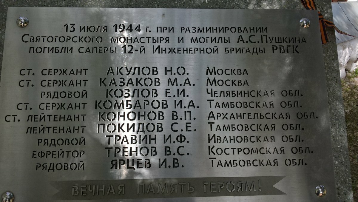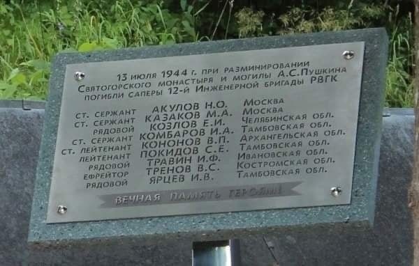 СПАСАЯ ОТ УНИЧТОЖЕНИЯ МОГИЛУ ПУШКИНА, ЗАМИНИРОВАННУЮ ФАШИСТАМИ, ПАЛИ СМЕРТЬЮ ХРАБРЫХ ДЕВЯТЬ МОЛОДЫХ САПЕРОВ.
