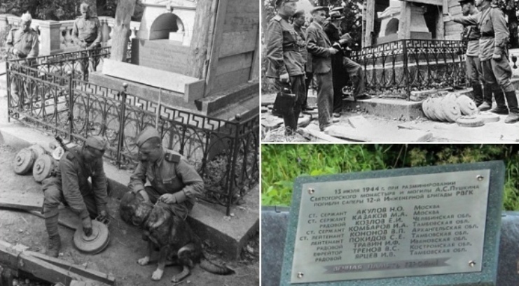Вся территория Пушкиногорского района к моменту освобождения от оккупации представляла собой огромное минное поле. А на могиле Пушкина саперы обнаружили противотанковые мины неизвестного образца - металлический брусок длиной около 80 см, начиненный 5 килограммами тротила. Мины имели сразу пять взрывателей, некоторые установлены на неизвлекаемость...