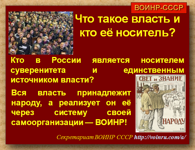 Три вещи никогда не возвращаются обратно – время, слово, возможность. Поэтому: не теряй времени, выбирай слова, не упускай возможность. Сегодня у вас еще есть такая возможность - не теряя времени вернуть украденную страну, собственность, власть. Всему этому и более, а именно, что и как надо делать правильно, чтобы стать конституционной легальной властью и законным хозяином страны, можно научиться в школе правовых знаний ВОИНР-СССР. Приглашаю только тех, кто готов учиться, самостоятельно думать и действовать, изменить себя и мир, стать человеком разумным.