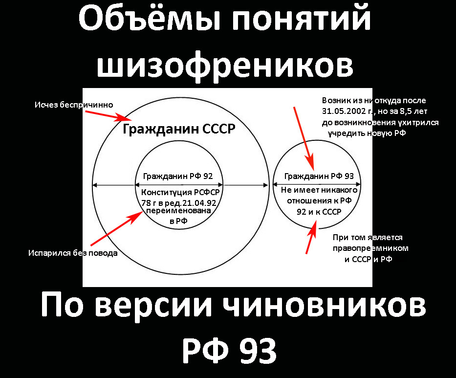 В результате госпереворота в нашей стране криминальной кпсссней, создания ими нелегальной ОПГ РФ 93, сложилась юридическая коллизия отсутствия правоспособности у РФ 93, ее нелегальности. В спешке преступники писали и пишут противоречивые тексты, выдаваемые за законы. При попытках выдать преступление и беззаконие за закон, смешать в одной кастрюле СССР И РФ 93, имитаторы государства наштамповали в своих "НПА", "ФЗ" уйму противоречий, которые можно и нужно использовать для своей выгоды в борьбе с "чиновниками"-мошенниками, торгашами, спекулянтами, не забывая о главной нашей цели - восстановлении конституционного порядка в СССР. Правопреемником СССР, согласно Венской конвенции о праве международных договоров, принятой 23 мая 1969 г., РФ 93 не является.