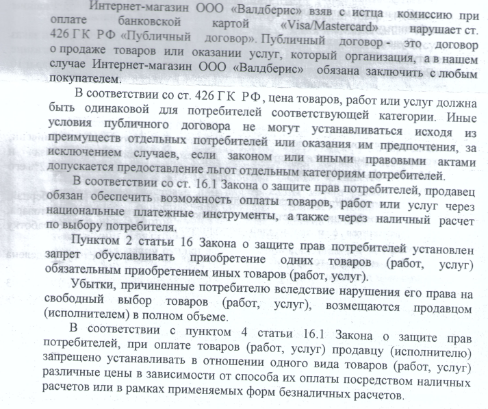 Правда потом в Wildberries догадались сделать наоборот: стали давать скидку тем, кто платит не Visa и MasterCard. Это уже не запрещено. Однако первоначально права потребителей были нарушены.