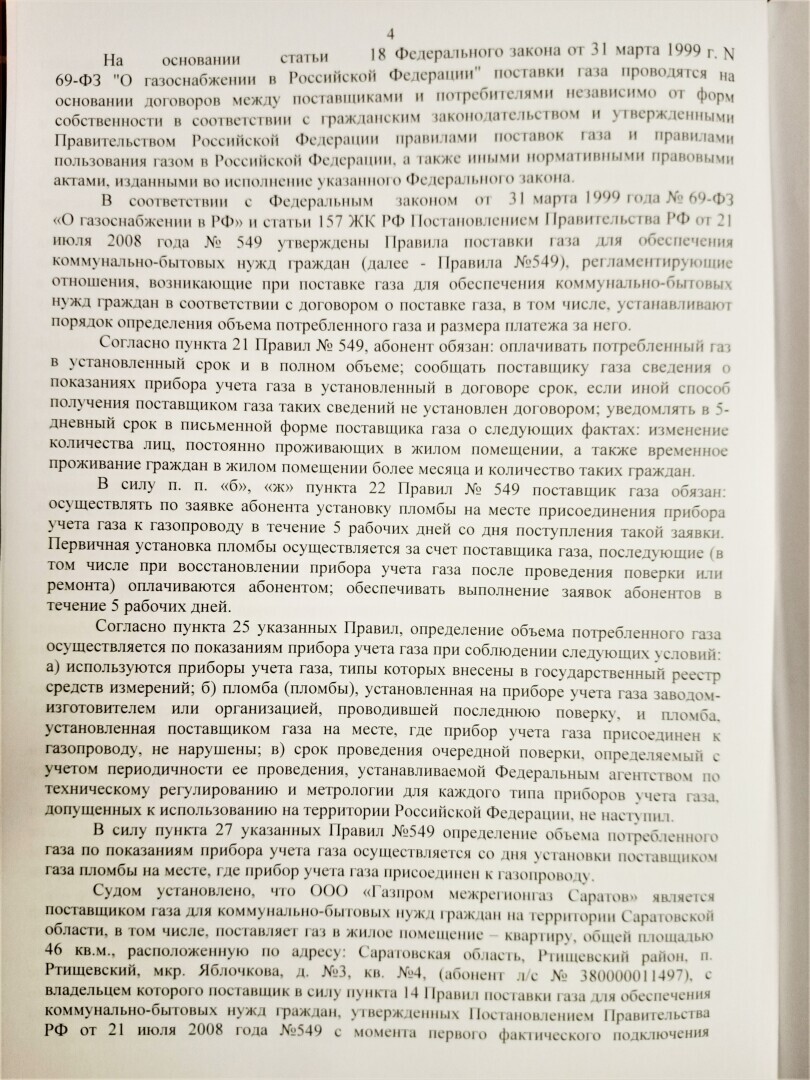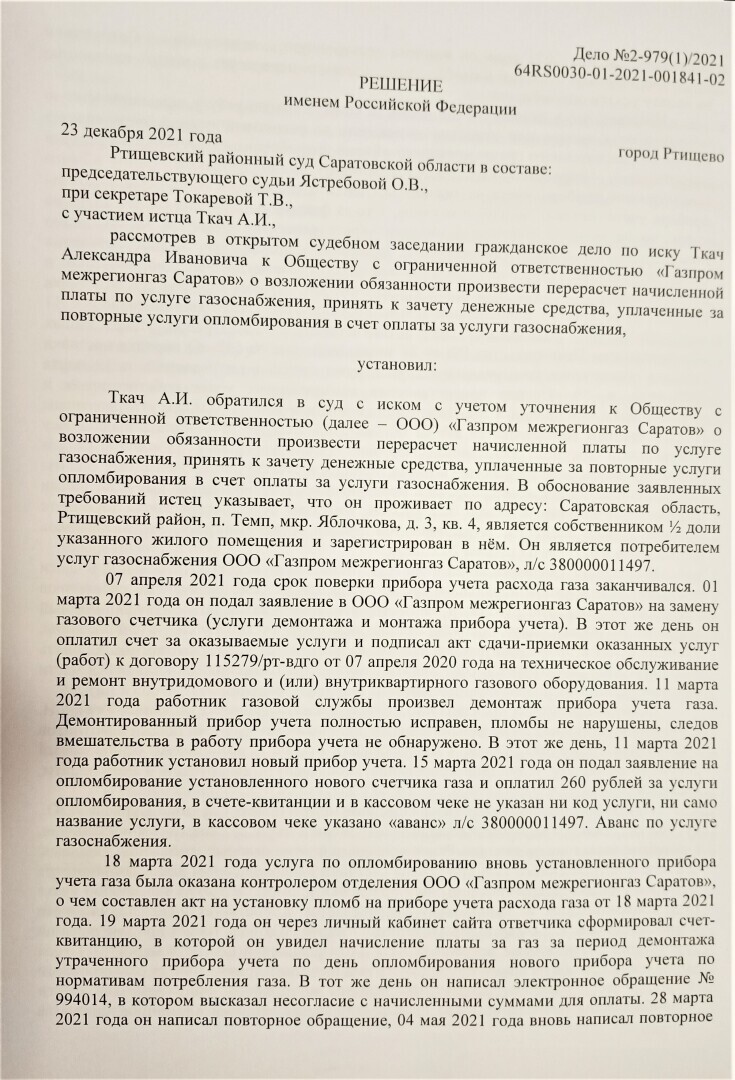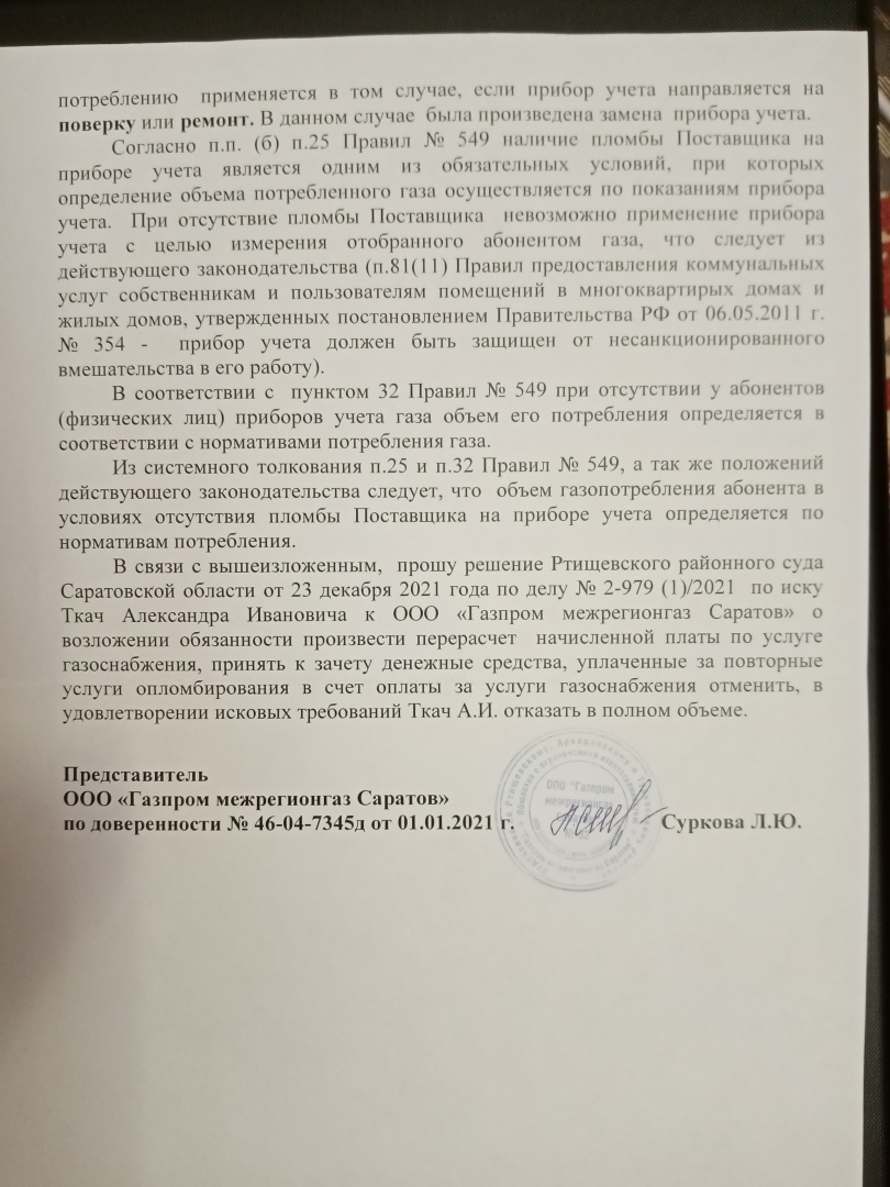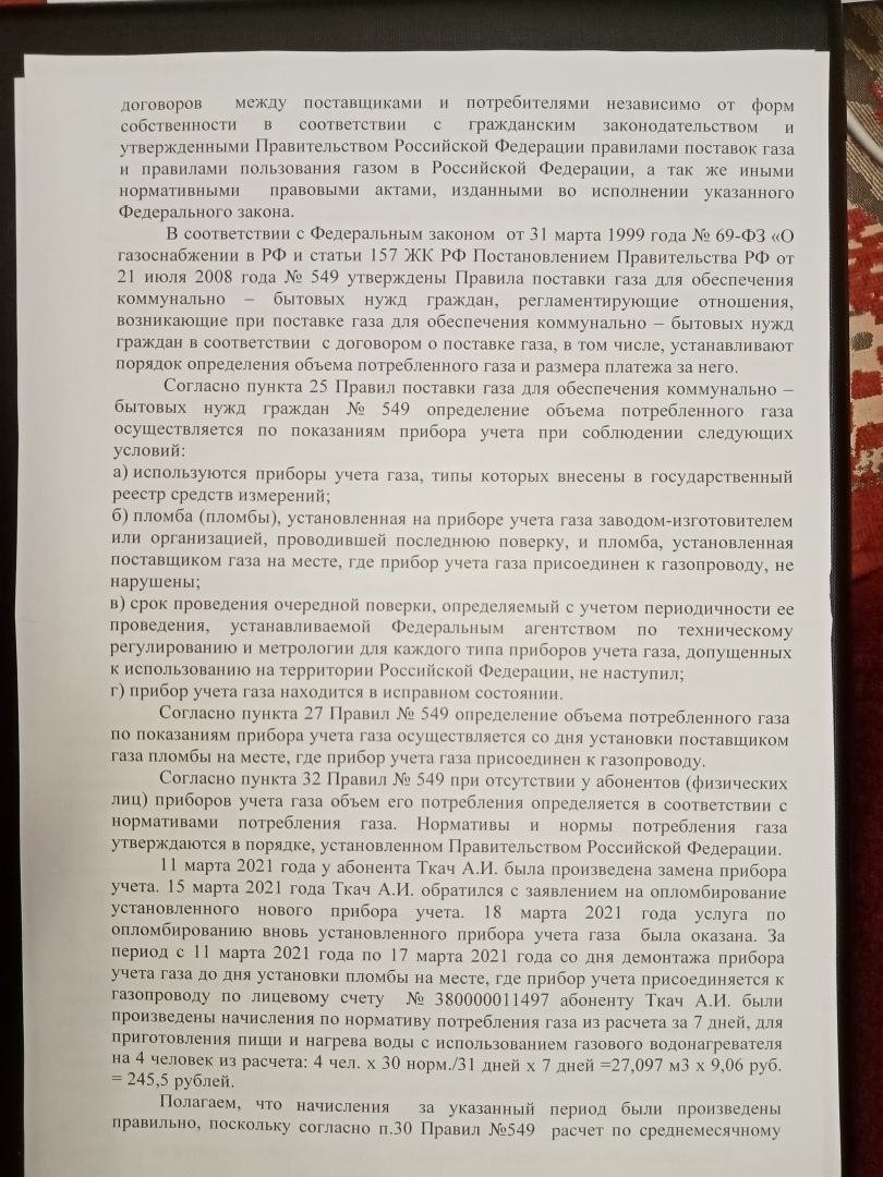 На первом заседании 15.11.2021 представитель ответчика (газовой службы) предоставил бухгалтерские справки (но не квитанцию) о начислении платы за опломбировку 260 руб, а начисление платы за газ по нормативам обосновывал только п. 32 Правил ПП 549.
