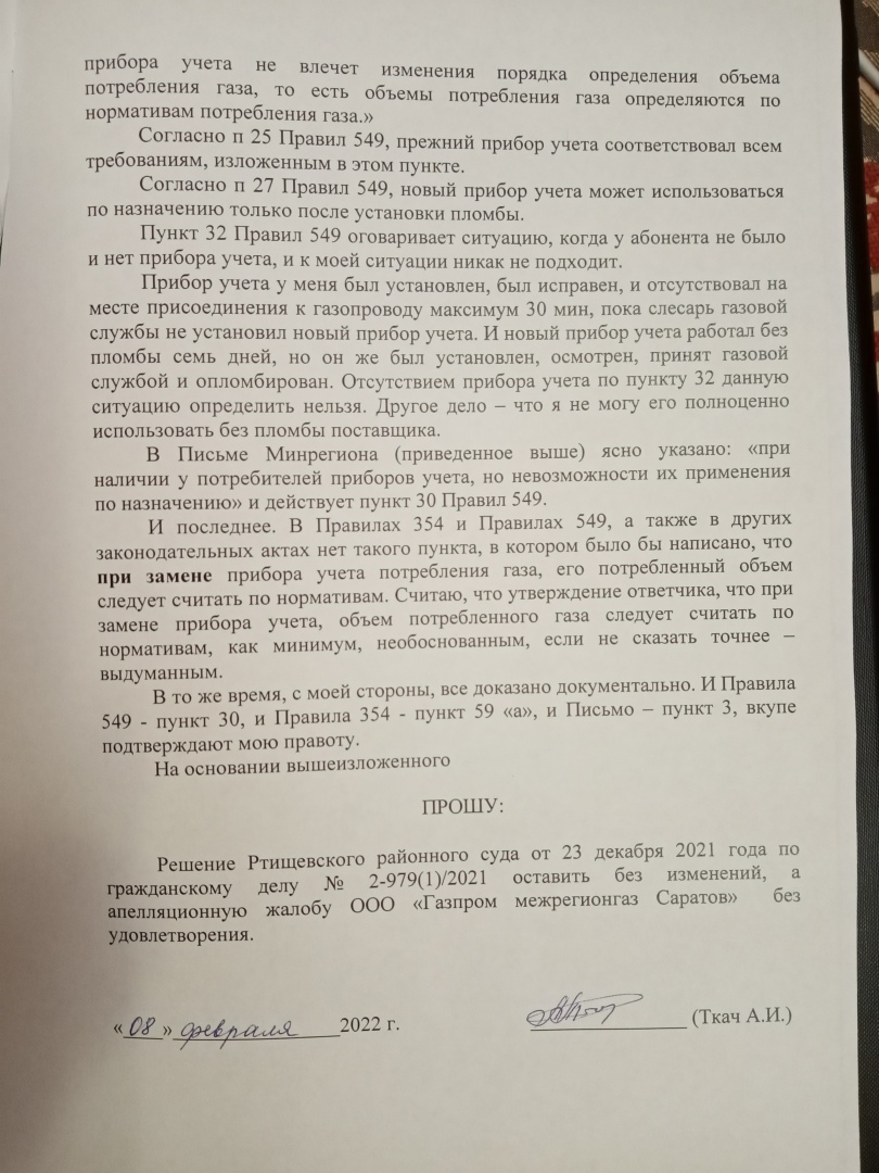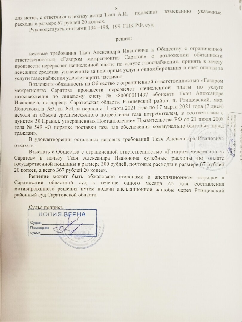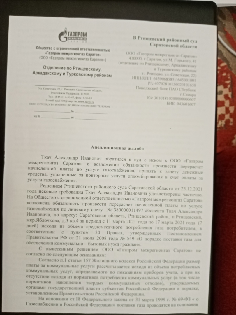 19 апреля 2022 г Саратовский областной суд отклонил апелляцию Ртищевского Газпрома и оставил Решение Ртищевского районного суда БЕЗ ИЗМЕНЕНИЯ !!! Вторая победа !!!
