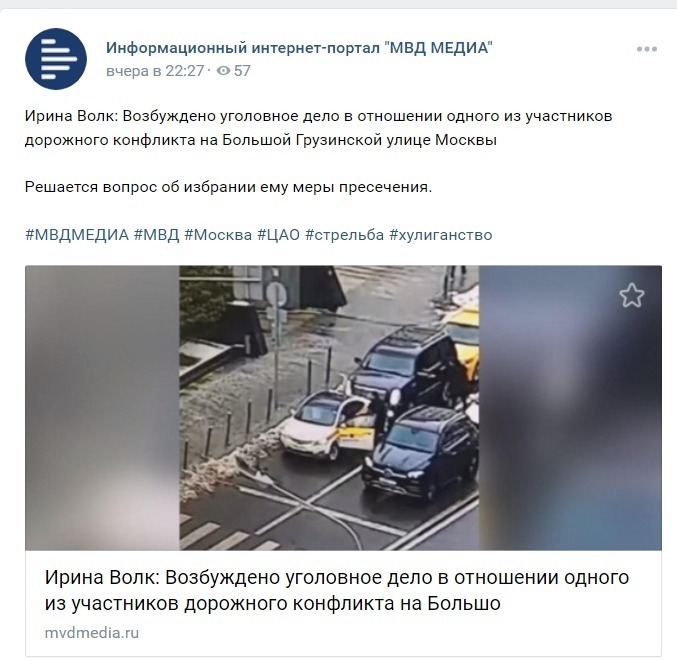 Ирина Волк: Возбуждено уголовное дело в отношении одного из участников дорожного конфликта на Большой Грузинской улице Москвы