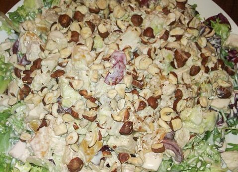 Соус (первый раз сталкиваюсь с таким соусом - очень вкусный, со вкусом красного вина и действительно - очень подходящего по вкусу к данному салату): смешать майонез, сливки, красное вино и апельсиновый сок, добавил по вкусу соль, перец. Соусом полил куриную смесь, сверху посыпал размельченным фундуком. Салат ушел на ура! вкусно!