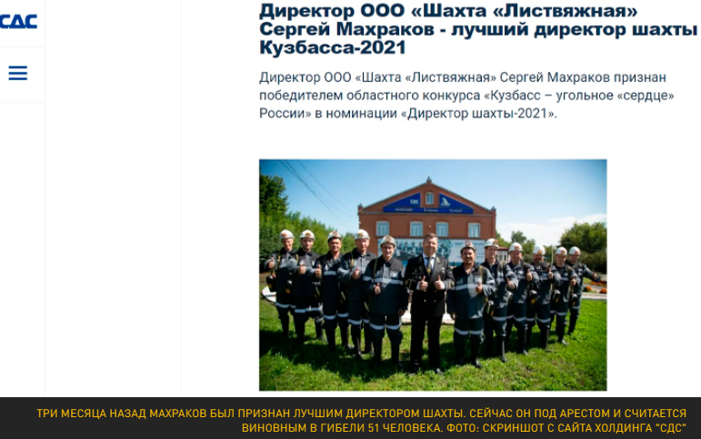 Просто в июле этого же года, примерно в то самое время, когда руководитель "Листвяжной" Махраков получал звание "лучшего директора", глава Ростехнадзора Александр Трембицкий и гендиректор холдинга "СДС-Уголь" (выручка 5,8 млрд рублей в 2020-м) Геннадий Алексеев подписали соглашение о взаимодействии.