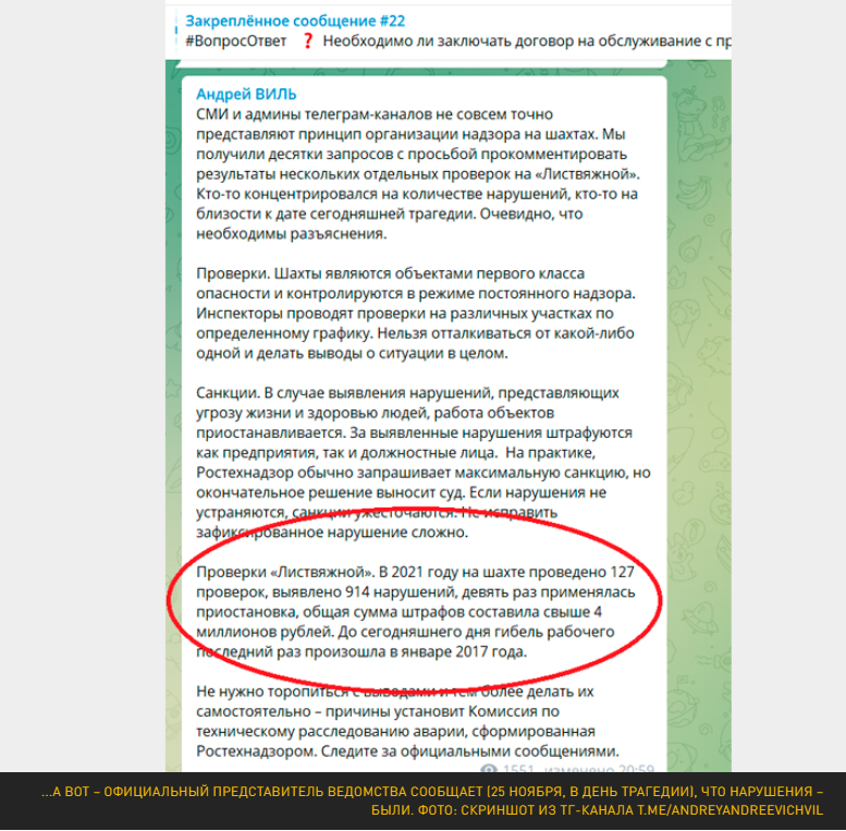 В 2021 году на шахте проведено 127 проверок, выявлено 914 нарушений, девять раз применялась приостановка, общая сумма штрафов составила свыше 4 миллионов рублей. До сегодняшнего дня гибель рабочего последний раз произошла в январе 2017 года,