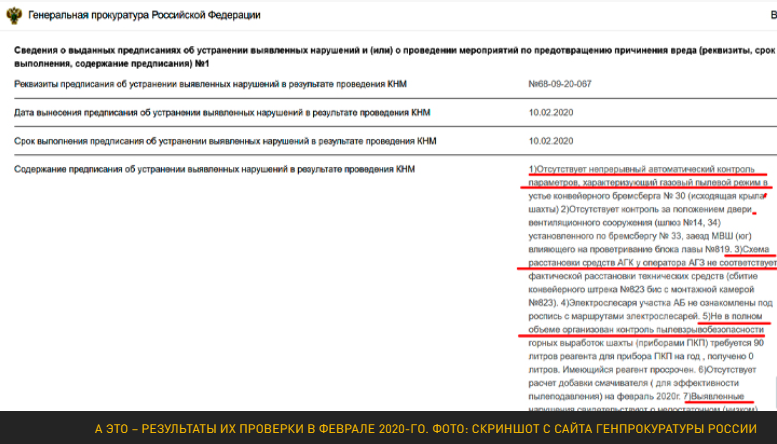 Более того, они же, Семыкин и Винокуров, наведывались в составе комиссии на "Листвяжную" и в прошлом году – в феврале 2020-го. И тогда тоже обнаружились нарушения в лаве №823 – и они также касались в том числе и датчиков аэрогазового контроля! Инспекторы называли виновных и наказывали их рублём. Но, что самое любопытное, на устранение отводилось от одного до трёх дней!