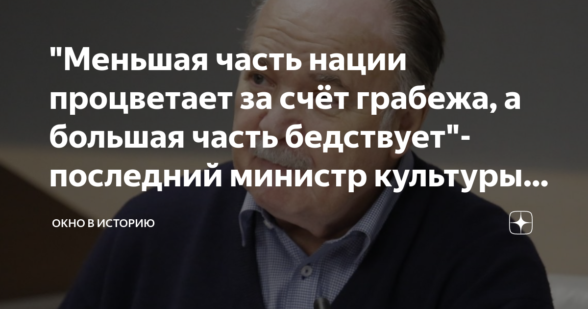 Источник: https://zen.yandex.ru/media/id/5fc097fb56aab14e82b6a963/menshaia-chast-nacii-procvetaet-za-schet-grabeja-a-bolshaia-chast-bedstvuet-poslednii-ministr-kultury-sssr-gubenko-o-rossii-619369c2bf6d9e620742ab7b