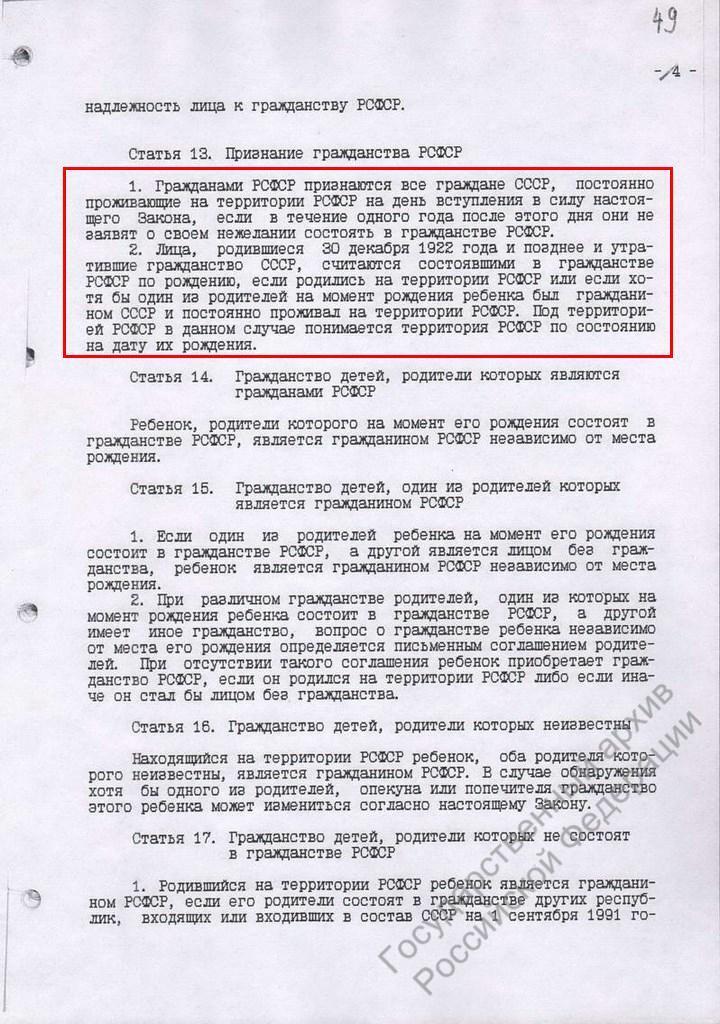 1 - Есть ошибочное мнение, что паспорт определяет гражданство человека. На самом деле, до наступления совершеннолетия мы не имеем паспортов, но являемся гражданами государства, по нашему месту рождения или по гражданству наших родителей. Паспорт это всего лишь один из документов, удостоверяющий личность человека. Паспорт не является основопологающим документом определяющим гражданство. Гражданство определяется по месту рождения, точнее выданному Свидетельству о рождении (статья 13, часть 1, закона №1518-1 от 23.05.1990 года "О гражданстве СССР")
