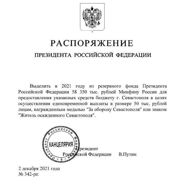 Президент поручил выделить в 2021 году Минфину России из резервного фонда президента РФ 58 миллионов 350 тысяч рублей и предоставить эти средства бюджету Севастополя «в целях осуществления единовременной выплаты в размере 50 тысяч рублей лицам, награждённым медалью "За оборону Севастополя" или знаком "Житель осаждённого Севастополя"».