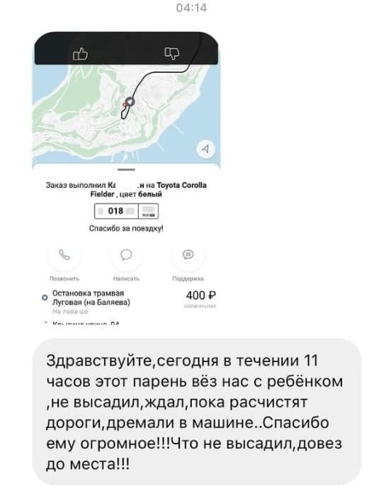 Утомленные пассажиры спали в машине, пока водитель пробирался по дорожным пробкам. Женщина с малышом были довезены до места назначения, спустя 11 часов (путь был в пределах города).