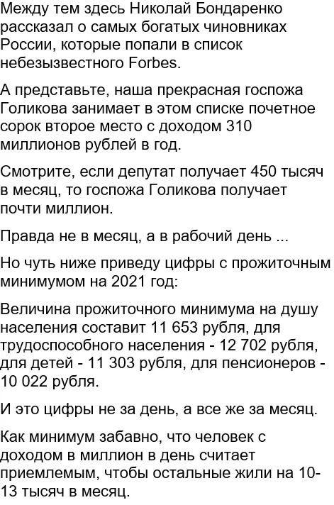 Ох, Голикова - Голикова) Да понятно же, что такого уровня товарищи и зарплату будут получать не 13000 руб. Никогда не были их зарплаты равны нашим пенсиям и минималкам. Это и есть неравенство. Как ни борись с ним, какие революции ни делай, всегда находятся те, которые хотят жить лучше и получать больше