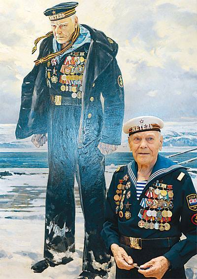 Возможно, я бы и не проявила интерес к этому художнику не попадись мне на глаза фотография, где запечатлён старый моряк на фоне картины со своим изображением. Фотография удивила и заинтересовала. Редко встречаются картины о войне, где персонажем является не выдуманный, а настоящий Герой. Быстро удалось узнать, моряк с фотографии это Юрий Александрович Фомичёв, участник войны, ушедший на фронт летом 1941 года и провоевавший морским пехотинцем до Победы. Благодаря своему высокому росту, юноше удалось уговорить военного комиссара взять его в Армию в 16 лет.