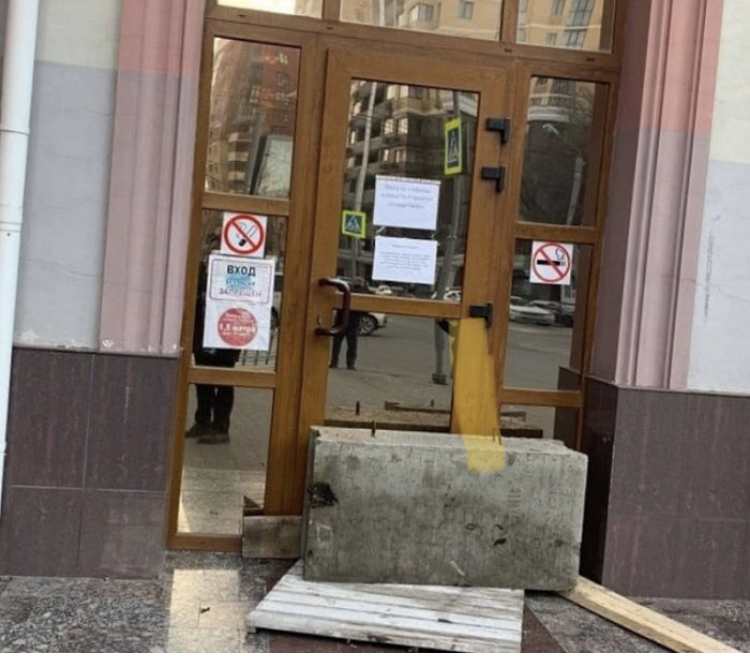 А 3 декабря спецтехника доставила сюда бетонные блоки. Блоки уложили у входа, таким образом, перекрыв возможность входа и выхода в здание. Блоки затянули баннерами с символикой ЧМ-2018. Далее рабочие попытались заварить дверь, но у них ничего не вышло – в ответ на установку блоков добровольно заточившие себя начали обливать рабочих ржавой водой.