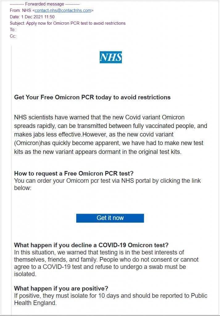Британская организация «Which?» опубликовала два примера фишинговых писем, в которых злоумышленники прикрывались медицинскими учреждениями и якобы предупреждали людей об «омикроне».🦠