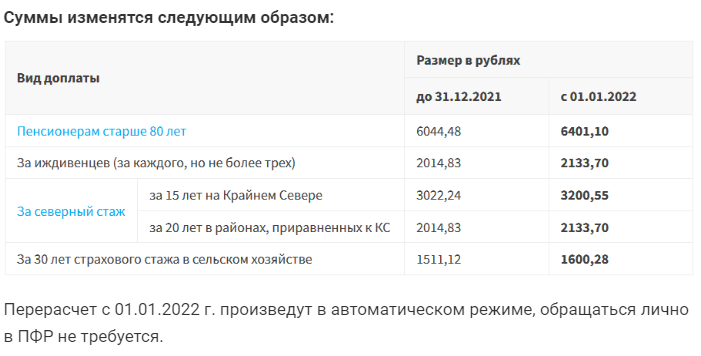 При этом одновременно с ежегодной индексацией величины фиксированной выплаты пересчитываются и суммы назначенных пенсионеру надбавок. Так с 1 января 2022 г. размеры доплат вырастут на 5,9% вслед за индексацией ФВ.