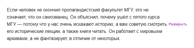 Понятно, что у него нет исторического образования, он всё это себе придумал. Но в принципе он не кретин, не дурачок. Высшего образования у него нет, он немножко самозванец в этом плане, но он не глупый дядька. Такой забавный, конечно.