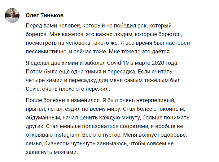 Что рассказал Олег Тиньков о продолжении борьбы с лейкемией?