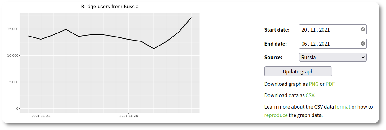 На графике видно, что плавный (пока) скачок начался в начале декабря и совпадает с общероссийской, полномасштабной блокировкой экосистемы Tor. На данный момент пик (данные из csv-документа, обновляются не так оперативно) составляет 17 к пользователей в сутки по использованию мостов клиентами из РФ подключающимися к сети Tor, что составляет 0,005% пользователей от общего % пользователей услугами Tor в РФ. А в масштабах всей сети Tor эта цифра (17 к пользователей) и выводит РФ на 1 место среди всех стран по наибольшему подключению клиентов к системе Tor через мосты, обгоняя в т.ч. и Беларусь на несколько позиций (раница в кол-ве населения не дали случиться обратному).