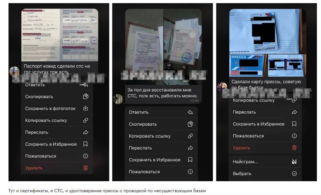 Когда я спросил о гарантиях, мне выдали ссылку на книгу отзывов, где благодарные клиенты хвалят продавцов поддельных сертификатов и справок. Оказалось, список документов, которые можно сделать, невероятно широк: кроме сертификатов и тестов ПЦР на продажу предлагают дубликаты СТС, удостоверения прессы «с проводкой по базам» и любую другую полиграфическую продукцию.