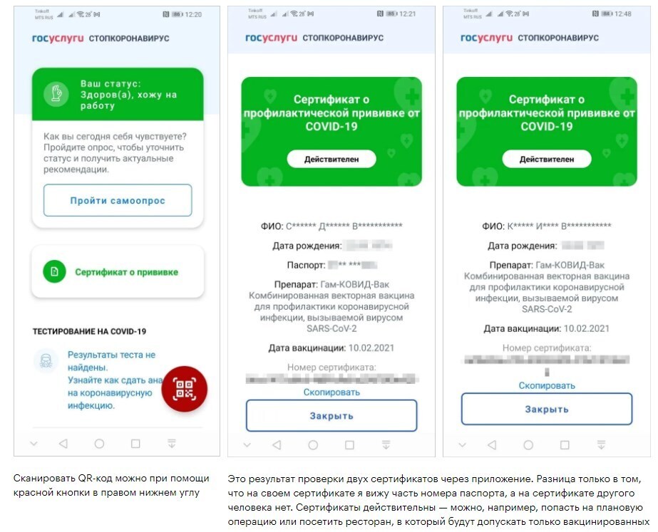 Полные данные человек, который проверяет сертификат, не увидит — приложение показывает только первые буквы фамилии, имени и отчества, дату рождения, первые и последние цифры номера паспорта. Персональные данные при этом не разглашаются. Но достаточно сверить эту информацию с паспортом и понять, действительно человек вакцинировался или заплатил 1200 Р за лист бумаги.