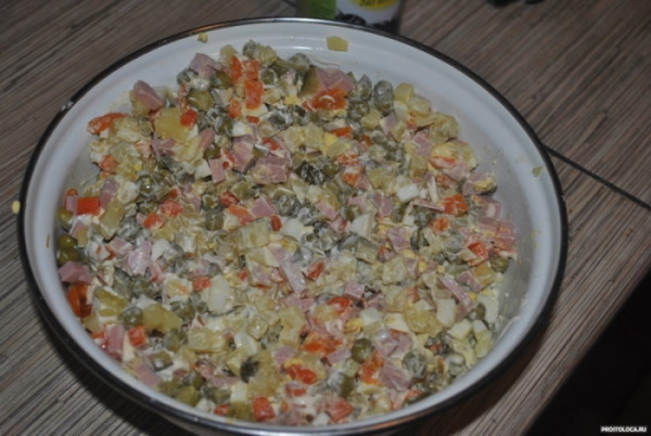 И в советские времена и сейчас по сей день символом новогоднего стола для россиян остается салат "Оливье". Конечно теперь уже не найти в продаже ту советскую колбасу, без консервантов и всяких вкусовых добавок, и все же лучше покупать для салата только самую лучшую колбасу.