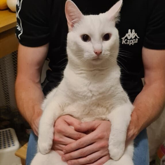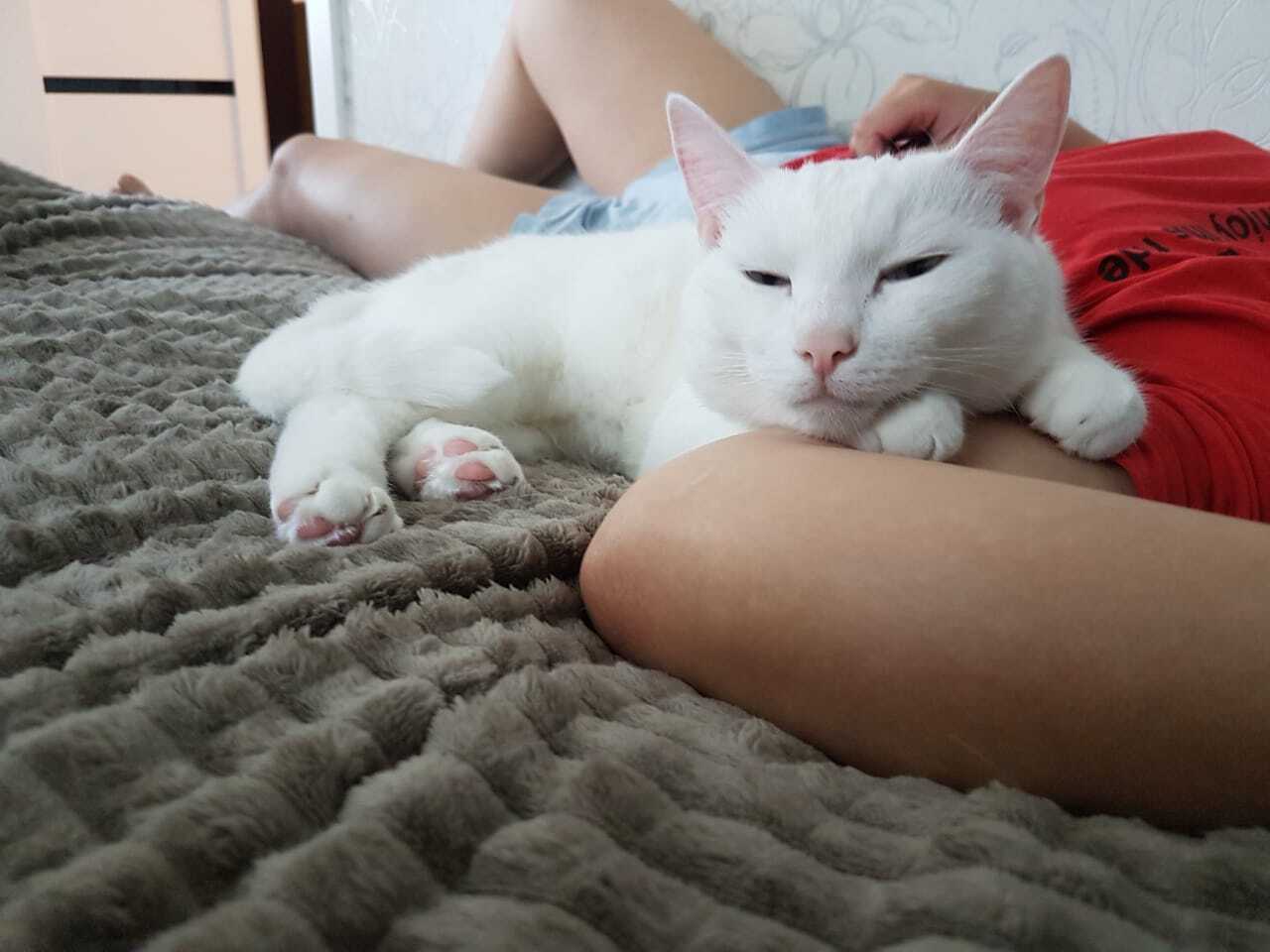 Это Юлиус, дочкин глухой котик. Он очень любит сидеть вот так)