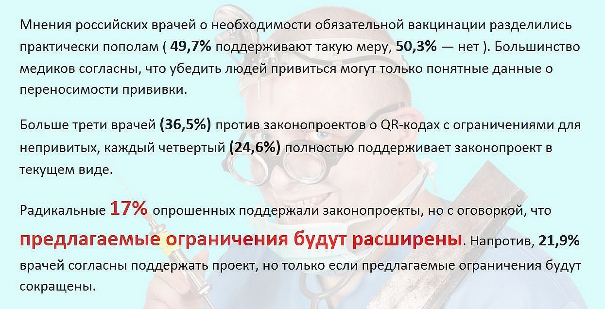 Как видите, почти пятая часть граждан в белых халатах, давших клятву Гиппократа, желает принудительно оцифровать своих пациентов, а сопротивляющихся отщепенцев лишить права на труд, вместе с заработками на продукты питания и прочую бытовуху, вкупе с ЖКХ и кредитами, с обнулением возможности передвижения и общения, оставив им только безнадёгу, в виде вымирания от болезней и голода, в процессе арестантского сидения в неоплаченных квартирах.