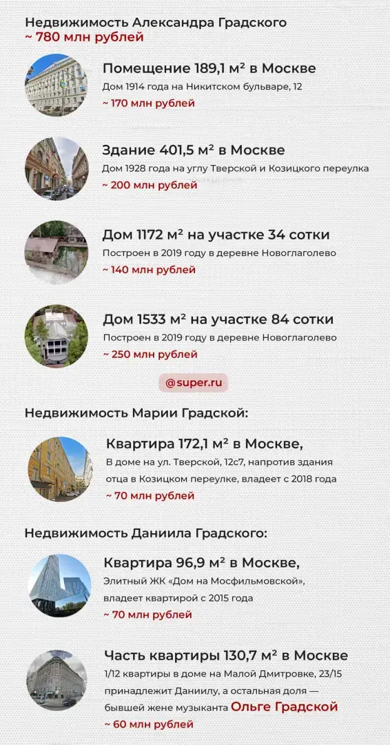 Оба старших ребенка Градского также обеспечены собственным жильем. Даниил и Мария владеют квартирами в центре Москвы стоимостью по 70 млн рублей каждая.