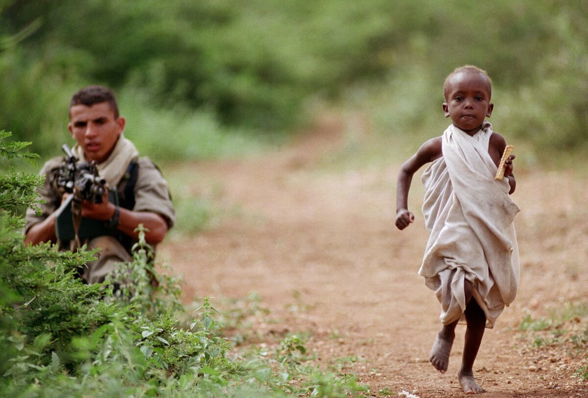 Сомалийский мальчик бежит в сторону прибывшего с гуманитарной помощью конвоя. Французский легионер следит за безопасным прибытием припасов. Операция «Восстановление надежды» - это одобренная ООН американская инициатива, направленная на то, чтобы международная помощь действительно доходила до тысяч голодающих.