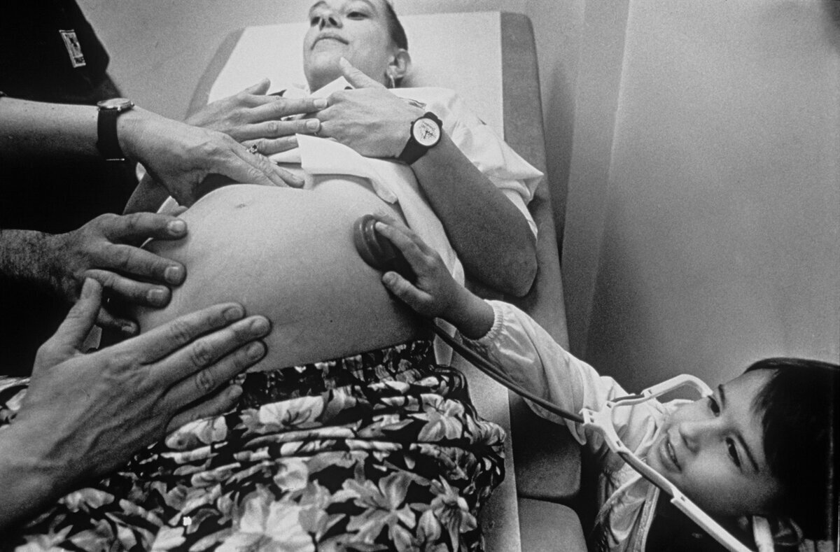 Джозеф Джезуальди слушает звуки, издаваемые его будущей сестрой во время посещения дородовой клиники.