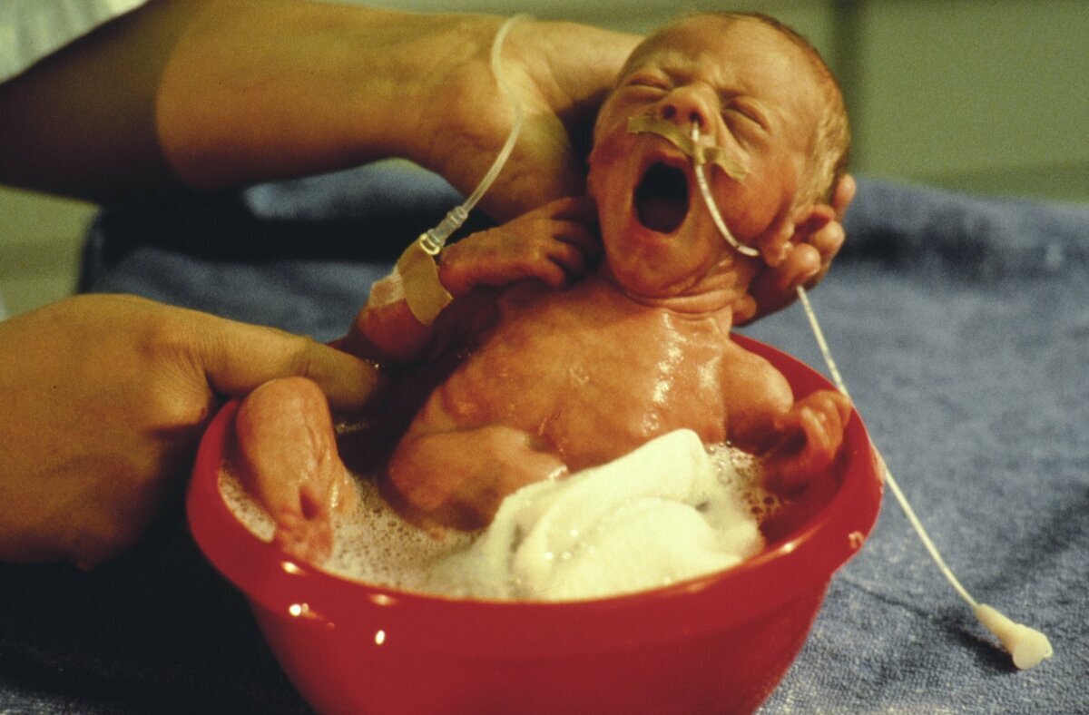 В возрасте трех недель этот ребенок весит всего 1200 граммов. Обычный салатник служит для него ванной.