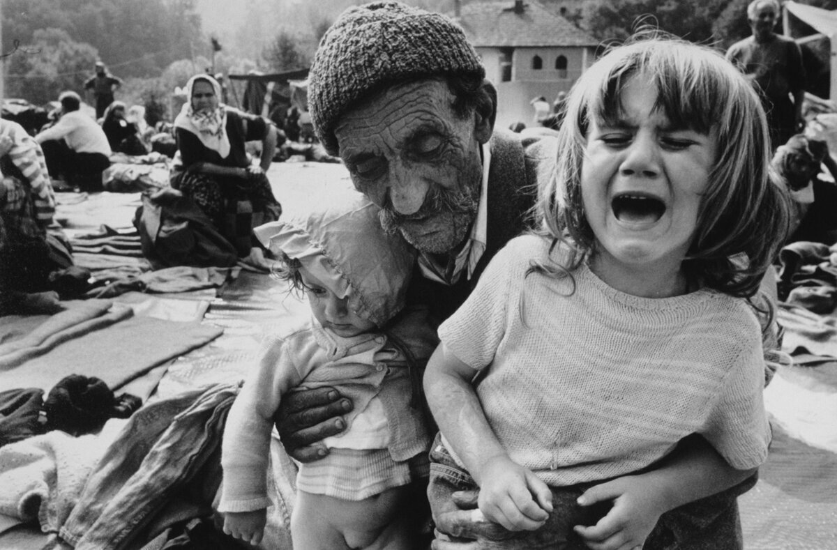 Боснийский дедушка с внучками в лагере беженцев Организации Объединенных Наций в Кладани, Босния и Герцеговина. Тысячи молодых людей убиты и пропали без вести, пожилые деды заботятся о маленьких детях.