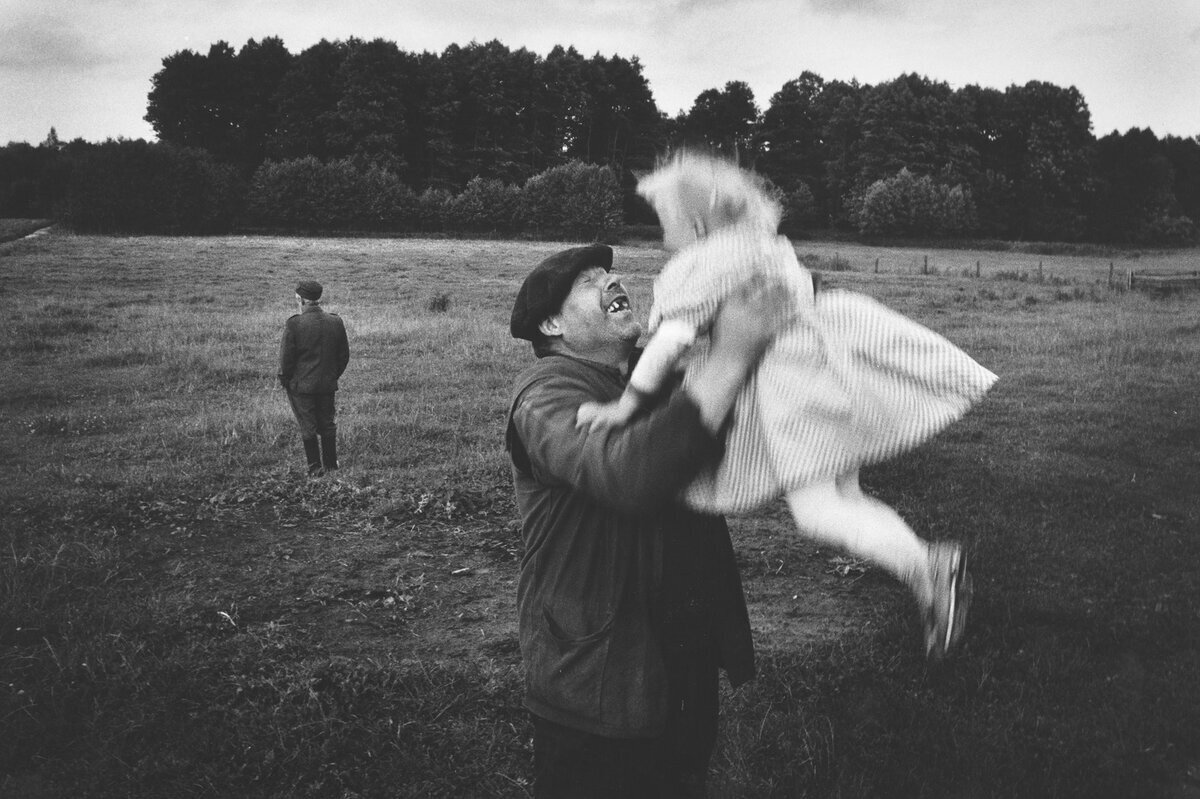 Дедушка кружит свою внучку в воздухе пока ее отец смотрит на лес.